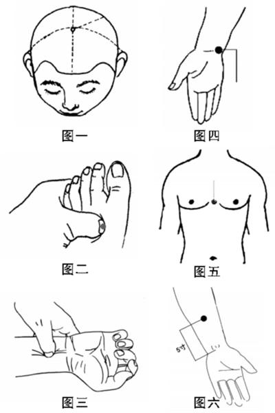 穴位選擇:郄門穴(圖六),在腕橫紋上5寸,掌長肌腱與橈側(cè)腕屈肌腱之間。大致相當(dāng)于腕橫紋和肘橫紋中點,兩條肌腱中間,神門、內(nèi)關(guān)穴位置如前所述。