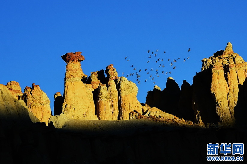 一群鳥兒飛過朝陽照耀下的土林(10月17日攝)。新華網(wǎng) 張宸攝