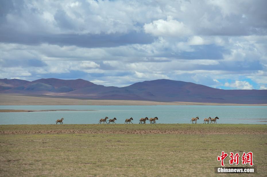 6月19日,西藏那曲羌塘草原上的藏野驢在湖邊奔騰跳躍。羌塘草原位于西藏自治區(qū)北部,平均海拔超過4600米,是目前中國海拔最高、面積最大的自然保護區(qū)。這里是野生動物的樂園,藏羚羊、藏原羚、藏野驢等珍稀野生動物與雪山、草地、藍天、白云,構(gòu)成撼人心魄的壯美畫面。 中新社記者 貢嘎來松 攝