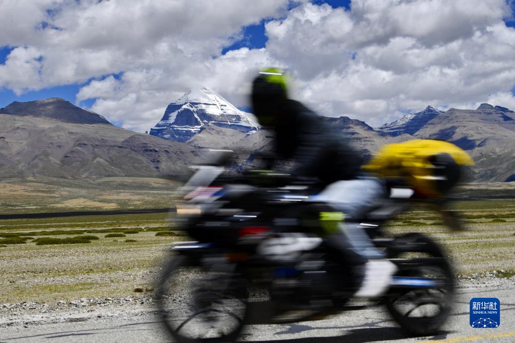 騎手駕駛摩托車(chē)經(jīng)過(guò)岡仁波齊景區(qū)(8月2日攝)。新華社記者 張汝鋒 攝