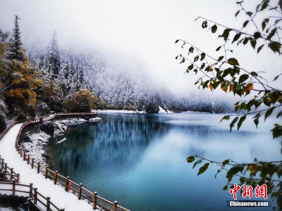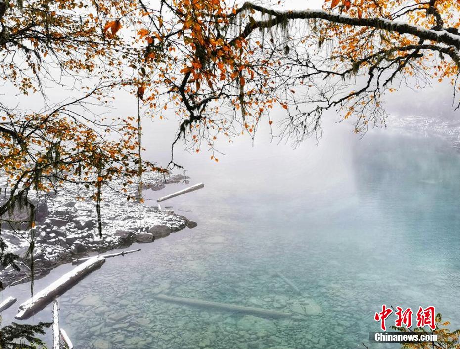 十月,九寨溝長海、原始森林等景點(diǎn)迎來入秋后的第一場雪。澄凈碧藍(lán)的海子和金色的彩林與潔白的雪花相映相襯,構(gòu)成一幅靜謐的美麗畫卷。遠(yuǎn)遠(yuǎn)看去,成片的彩林被一朵朵雪花點(diǎn)綴,美得像童話世界一般。 梁峰 攝