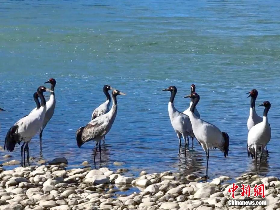 圖為黑頸鶴在雅魯藏布江畔覓食、嬉戲。袁相普 攝