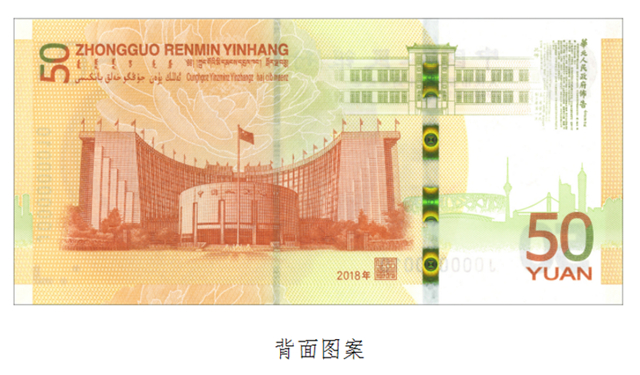 紀(jì)念鈔背面主景圖案為中國人民銀行大樓,輔以牡丹花、中國人民銀行舊址、第一套人民幣發(fā)行布告及城市建筑剪影圖案。票面左上角為面額數(shù)字“50”,中國人民銀行漢語拼音字母和蒙、藏、維、壯四種民族文字的“中國人民銀行”字樣與面額。票面下方為行長(zhǎng)章與年號(hào)文字“2018年”。票面右下角為面額數(shù)字“50”,漢語拼音字母“YUAN”。