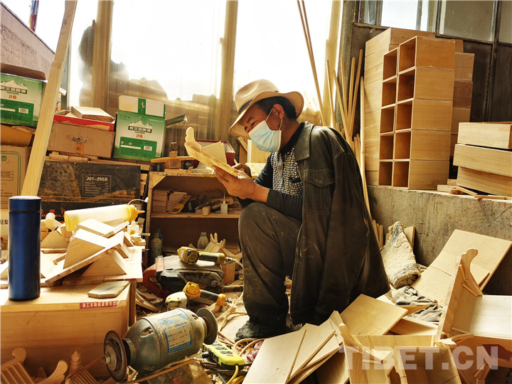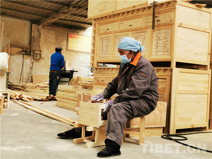 當記者走到坐在家具工廠認真工作的南拉加身邊時,他一手扶著拐杖慢慢起身問候。記者采訪時了解到,他家原先在常牧鎮(zhèn)附近的豆后漏村,家中只有他一人,生活拮據(jù)。今年56歲的他,2015年開始在貴德縣東方殘疾人福利有限公司工作,說起現(xiàn)在的生活,他微笑著說:“現(xiàn)在呀,我們和老板一起住,一起吃飯。每個月工資2300元,再加上每逢節(jié)假日,公司老板都會給我們發(fā)慰問品、慰問金,很滿足?!?/p>