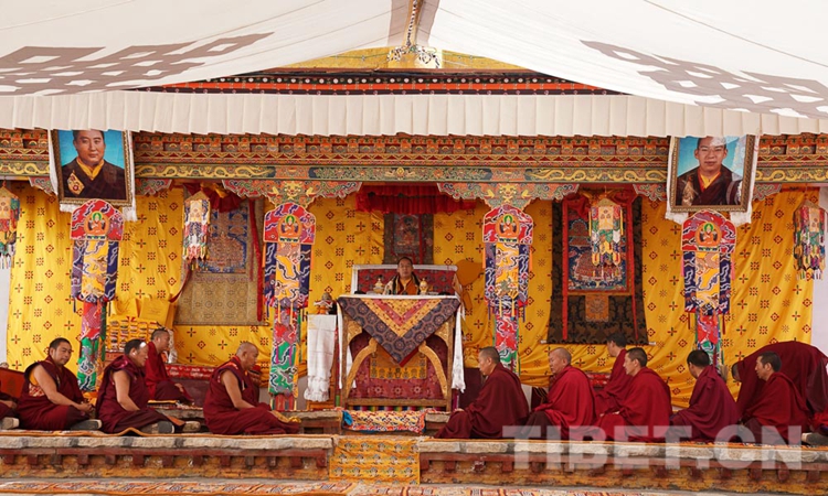 在熱堆寺,十一世班禪禮佛并為正在修建的大殿開光加持。隨后,十一世班禪在寺內(nèi)辯經(jīng)場為僧眾摸頂,并傳授《菩提道矩論》。