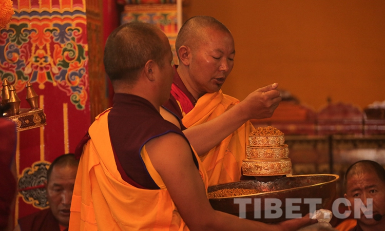 圖為十一世班禪在桑普寺拋灑青稞、祈愿豐收 攝影:王淑