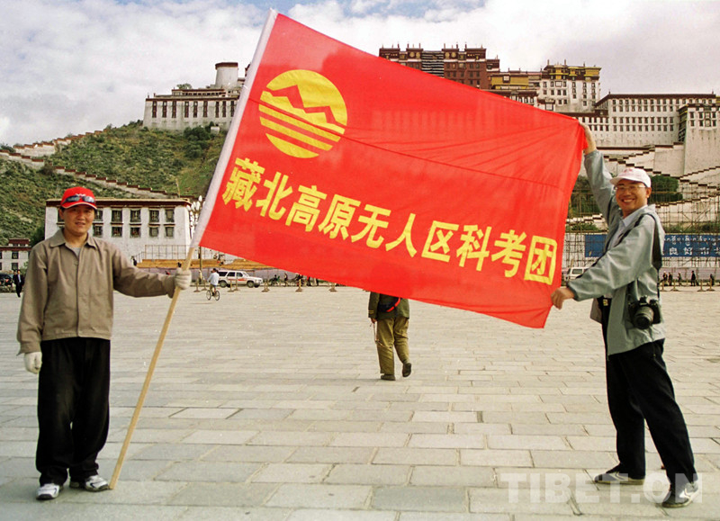 這是唐召明在隨藏北高原無人區(qū)科考團(tuán)出征時,展隊旗拍照留念(唐召明提供,2001年攝)