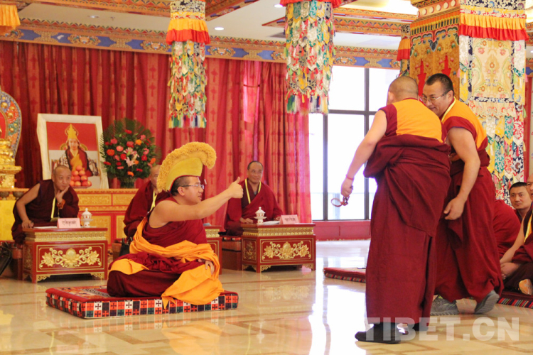 被主考官點(diǎn)名上場的考僧,身披黃色法衣,結(jié)跏趺坐于考場正中佛墊,屏氣凝神。提問辯經(jīng)人員用“諦……”聲提示“舌戰(zhàn)”開始,并在考場上來回走動間口若懸河、滔滔不絕,即興向考僧提問。提問過程中,辯經(jīng)人員常會借助各種手勢來增強(qiáng)辯論的力度。如右手甩念珠,快速跨步向前,高舉右手,用力擊掌,聲如裂石,令人振奮??忌仨毤芯?,意志堅定,沉著應(yīng)戰(zhàn)。不得不說,雙方常會言辭激烈,爭辯得面紅耳赤,這種情況下,仍能夠從容不迫、應(yīng)答得體的佼佼者才能得到認(rèn)可,脫穎而出。