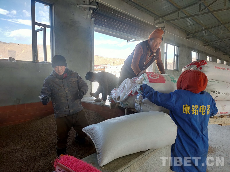 在該園的格薩甲波糧倉(cāng)現(xiàn)場(chǎng),裝滿糧食的拖拉機(jī)和貨車,有的忙著把青稞卸下來,有的忙著把青稞倒進(jìn)糧食精選機(jī)里、有的忙著稱重、有的忙著做登記,忙得不可開交。