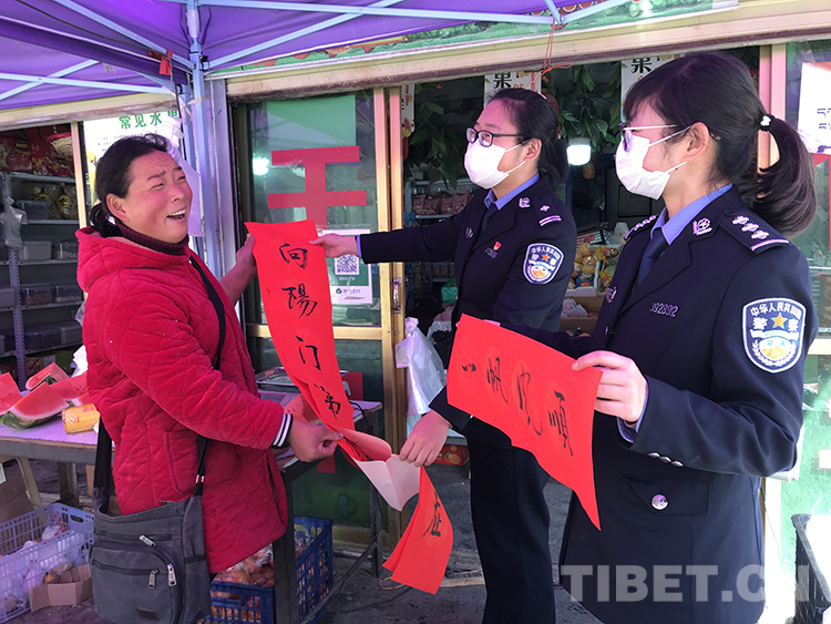 2月7日,拉薩邊檢站邀請(qǐng)拉薩市文聯(lián)書法家協(xié)會(huì)共同開展“同心同書——祖國新春好”送萬福進(jìn)萬家活動(dòng)。4名書法家揮毫潑墨,書寫漢文藏文春聯(lián),散發(fā)著墨香的春聯(lián)凝聚著無限的祝福。隨后,邊檢站格?;ㄅ訄?zhí)勤隊(duì)民警為駐地商戶送“?!彼痛郝?lián)。在駐地的一家超市,商戶張大姐興高采烈地與民警一邊貼春聯(lián),一邊笑著說:“感謝你們送來的新春祝福。今年雖然沒能回家過年,但有你們的陪伴照顧,我們感到很開心?!?/p>