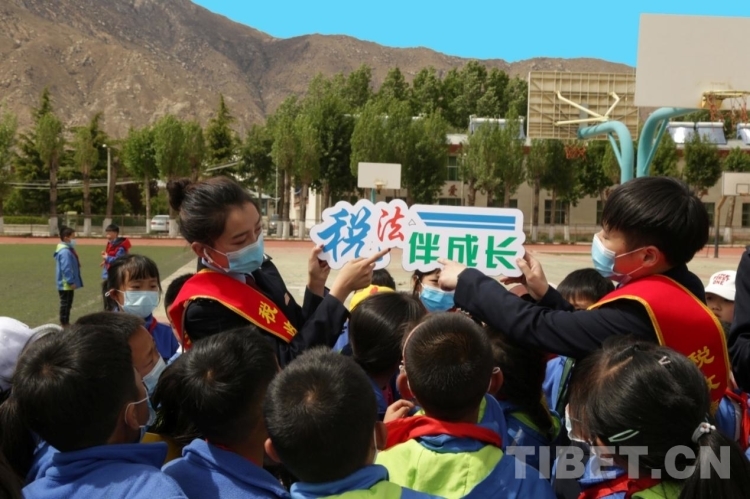 圖為西藏稅務(wù)干部在小學(xué)宣傳稅收知識