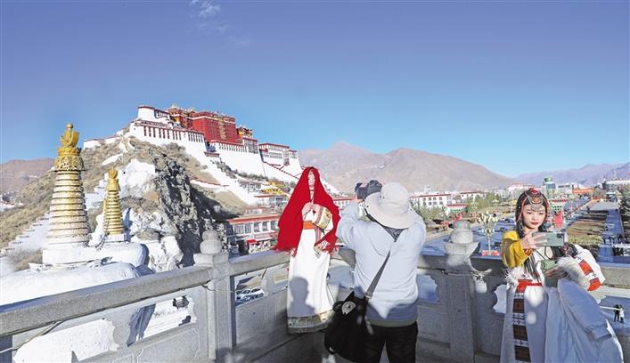 圖為游客在布達(dá)拉宮前拍照留念。記者 格桑倫珠 攝 圖片來(lái)源:西藏日?qǐng)?bào)