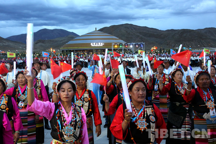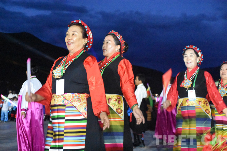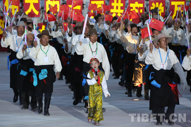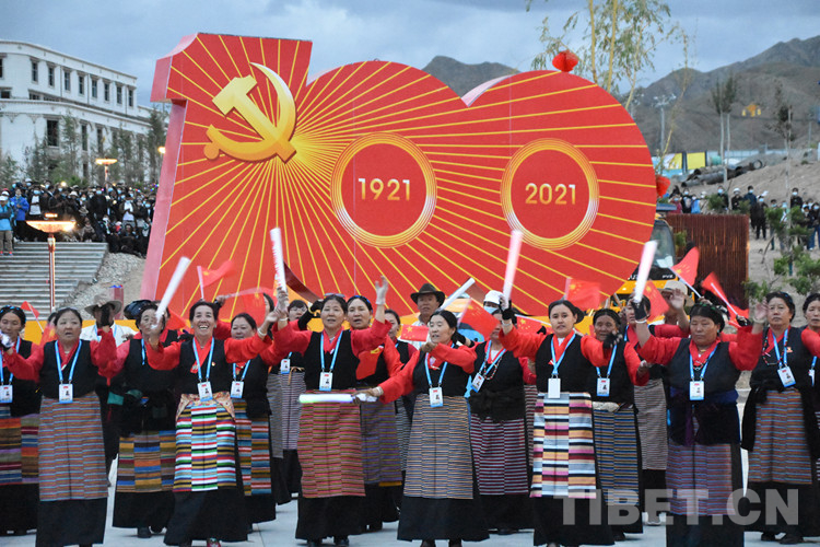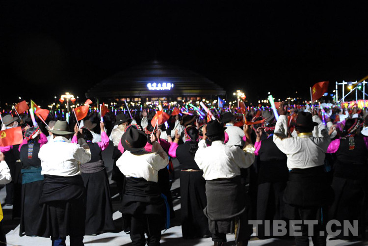 珠峰文創(chuàng)園區(qū)的聯(lián)歡活動(dòng)分為三個(gè)章節(jié),以《在燦爛的陽(yáng)光下》《各族人民感恩黨》《西藏人民齊歡唱》三首歌曲作為開(kāi)篇樂(lè),來(lái)自日喀則各族各界的演員們,身著日喀則特色節(jié)日盛裝,在廣場(chǎng)中央,擺出數(shù)字“100”的造型,跳起歡快的鍋莊舞,在燈光的輝映下,造型美輪美奐。