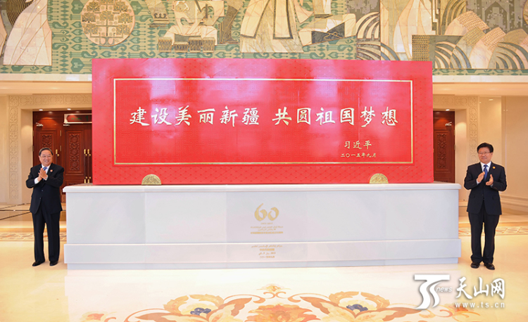 2015年9月25日,時(shí)任中共中央政治局常委、全國政協(xié)主席、中央代表團(tuán)團(tuán)長俞正聲和時(shí)任中共中央政治局委員、自治區(qū)黨委書記張春賢一同為習(xí)近平總書記題詞賀匾揭幕。攝影:新疆日報(bào)記者盧民一