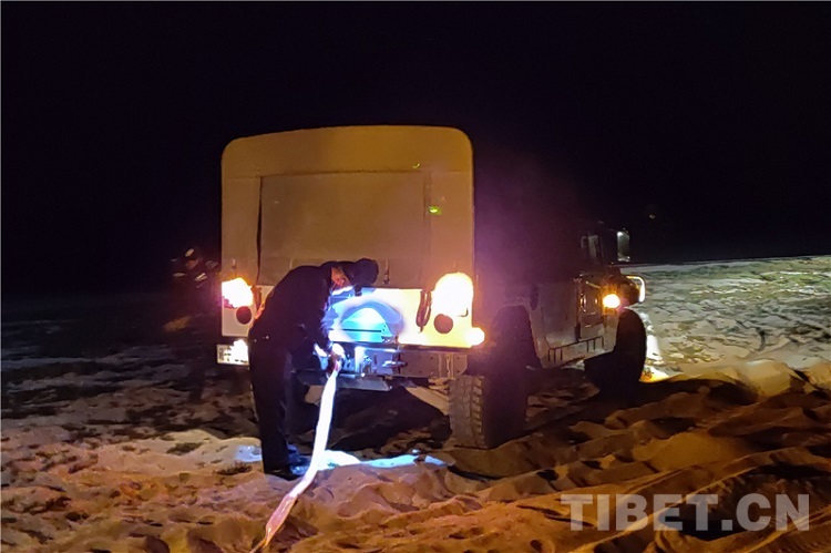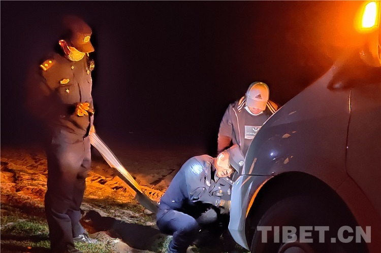 據(jù)了解,3名游客在自駕游玩過程中,想前往拉昂錯(cuò)湖邊停留一會(huì)再前往縣城。由于天黑視線模糊,在湖邊行駛時(shí)誤入沙地,立即開始倒車自救,但由于沙土松軟,車輛左右搖擺,越陷越深。在觀察、詢問無人員受傷或身體不適后,救援民警立即開展救援工作。