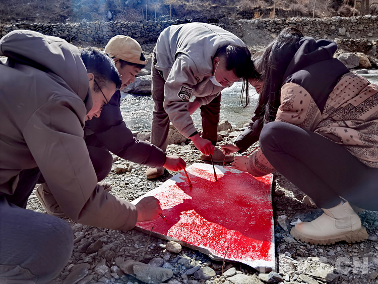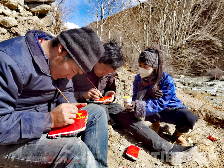 圖為卡熱鄉(xiāng)6個(gè)村(居)第一書(shū)記及邊據(jù)村駐村工作隊(duì)正在石頭上手繪國(guó)旗