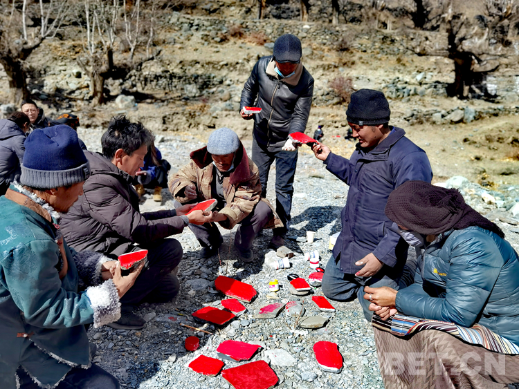 圖為黨員和群眾在柴火旁烤干石頭畫(huà)上的顏色