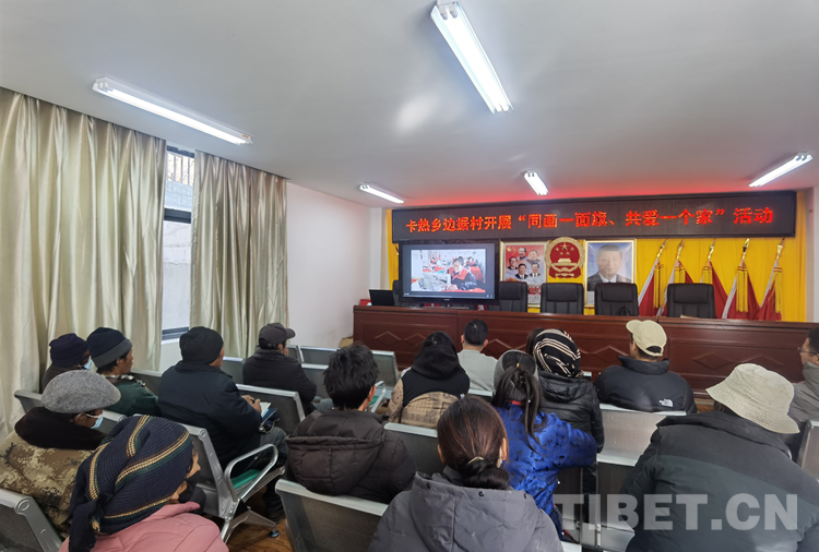 圖為卡熱鄉(xiāng)6個(gè)村(居)第一書(shū)記和邊據(jù)村黨員、群眾代表正在觀看講述西藏各族人民愛(ài)護(hù)國(guó)旗的視頻
