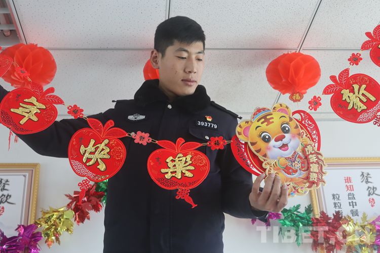 圖為日喀則邊境管理支隊(duì)昌果邊境派出所九年未回家過春節(jié)的民警郜曉占布置春節(jié)裝飾