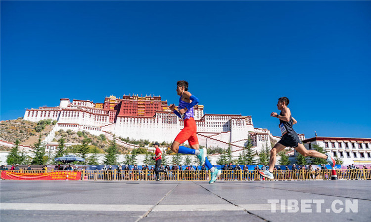 圖為拉薩半程馬拉松比賽中運(yùn)動(dòng)健兒從布達(dá)拉宮前飛奔而過 攝影:趙耀