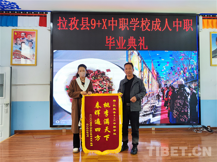 典禮上,拉孜縣9+X中職學校校長旦珍旺加對廣大畢業(yè)生殷殷囑托,希望他們在今后的工作崗位上事業(yè)有成、蒸蒸日上。隨后由成人中職學校代表、學生家長向?qū)W校贈送錦旗,以感謝學校一直以來為學生們提供學習與實踐平臺,為孩子們培養(yǎng)技能。