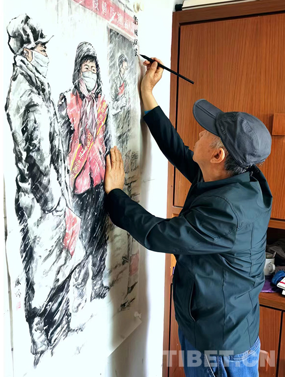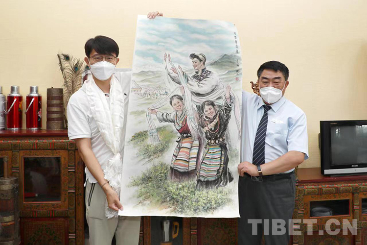“我愛人看到了咱們館(西藏文化博物館)發(fā)的征稿啟事,然后就把這條信息發(fā)到家庭群里邊。過了不久,我父親說他畫了一張畫,讓我看看畫得怎么樣。我當(dāng)時還很意外,本來想鼓勵我兒子畫一張,結(jié)果我兒子沒畫,老爺子畫得還很好。”6月21日,張兆林先生將自己的作品《哈達(dá)寄深情》捐贈給西藏文化博物館,張兆林之子張安誠將作品送至博物館并收到了捐贈證書。