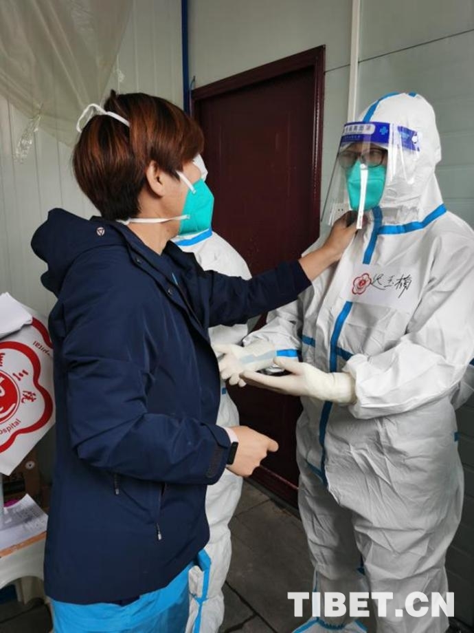 圖為劉研護(hù)士長為隊(duì)員檢查防護(hù)服