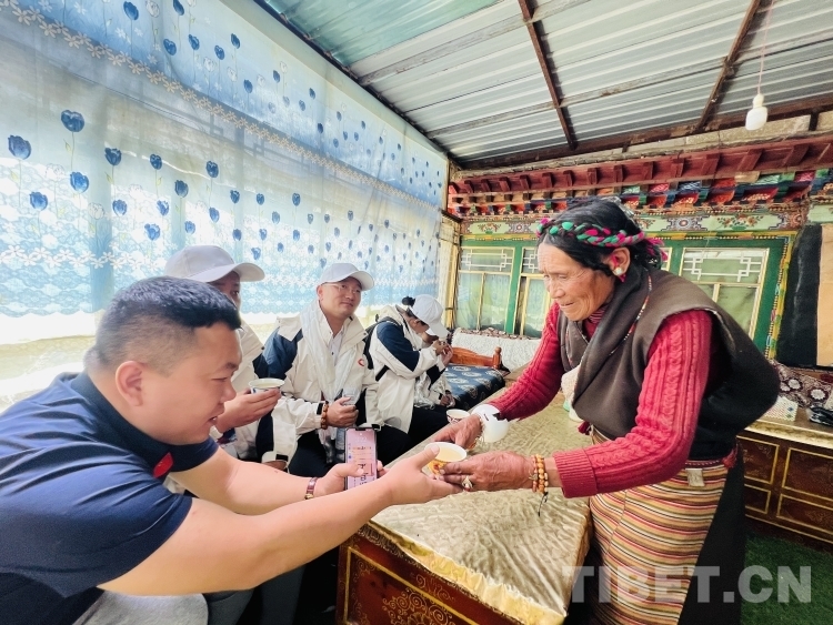 圖為慰問(wèn)困難家庭時(shí)阿媽次仁為愛(ài)心志愿者到酥油茶 攝影:德吉卓瑪