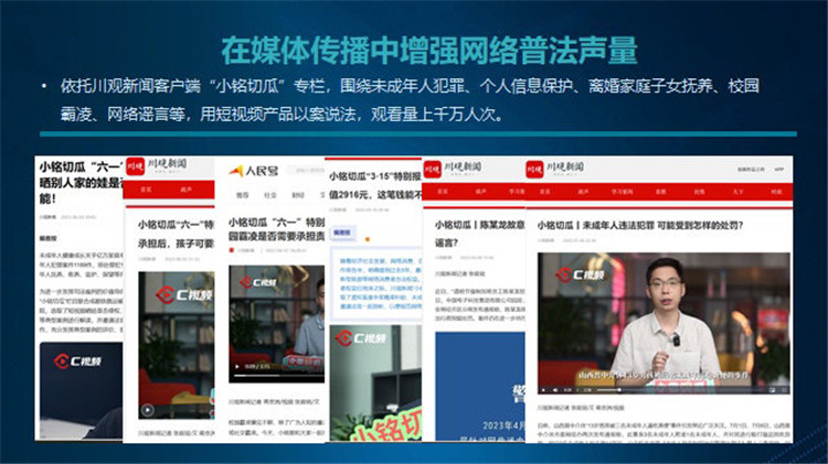 “全國網(wǎng)絡(luò)普法行?四川站”活動(dòng)啟動(dòng)儀式上,四川省公安廳、成都市檢察院、四川省未成年人網(wǎng)絡(luò)保護(hù)促進(jìn)會(huì)等單位代表進(jìn)行了網(wǎng)絡(luò)普法經(jīng)驗(yàn)分享,通過交流、學(xué)習(xí)推動(dòng)網(wǎng)絡(luò)普法工作開展。
