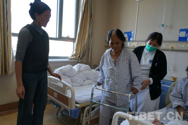 “卓瑪,你快給媽媽翻譯一下,用扶手架轉(zhuǎn)身的時(shí)候90度慢慢轉(zhuǎn),不要一次性轉(zhuǎn)180度,容易摔倒?!惫顷P(guān)節(jié)科護(hù)士薛小英從剛剛的驚慌中回過(guò)神來(lái),對(duì)著29床病人布姆的女兒大聲叮囑道。就在剛才,這個(gè)來(lái)自洛隆縣59歲的右膝大骨節(jié)病患者布姆在骨關(guān)節(jié)手術(shù)24小時(shí)后,借助扶手架,在護(hù)士的指導(dǎo)下已經(jīng)能夠下床走路了。只是初次使用扶手架還不太熟悉,剛才180度的大轉(zhuǎn)彎讓一旁陪護(hù)的護(hù)士不禁捏了一把汗。女兒卓瑪聽(tīng)到護(hù)士的話后趕忙告訴媽媽走路轉(zhuǎn)身要慢點(diǎn),小心別摔倒。