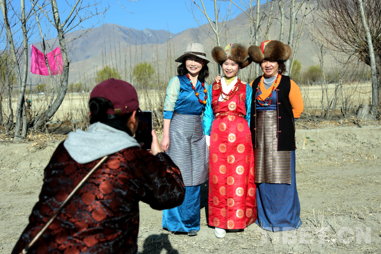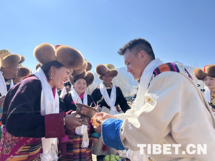 開耕儀式結(jié)束后,茶巴朗村藏戲隊(duì)成員們?yōu)樵缫褤Q好藏裝過來體驗(yàn)西藏民俗文化的游客們獻(xiàn)哈達(dá)、敬青稞酒、唱敬酒歌,游客們現(xiàn)場(chǎng)學(xué)起“三口一杯”與當(dāng)?shù)厝斯捕冗@美好的一天。西藏卓美旅行社負(fù)責(zé)人孫赫男介紹說:“西藏除了山水美景之外,春耕儀式也是非常具有當(dāng)?shù)靥厣奈幕?hào),能給人留下深刻記憶。今天,我?guī)е鴣碜员鄙蠌V等全國(guó)各地的游客來這里體驗(yàn)春耕儀式,讓大家看看西藏當(dāng)?shù)氐娜罕娛窃鯓娱_始春天的。游客們穿著藏裝,免費(fèi)品嘗青稞酒、酥油茶、牛肉、藏雞蛋等各種農(nóng)產(chǎn)品,還和充滿熱情的當(dāng)?shù)卮迕駛兓?dòng),他們玩得非常開心?!?nbsp;