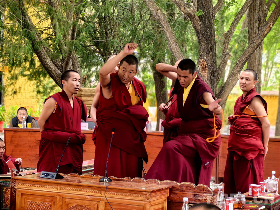 午后的陽光慵懶地灑在辯經(jīng)場,卻擋不住辯經(jīng)的智者們爭先恐后、高舉手臂提問,手臂向下?lián)]落,象征著智慧之劍砍向無知。熱烈的氣氛中,智者們拍手擊掌、獨立頓足、舞動佛珠、慷慨陳詞、大聲質(zhì)問,仿佛如此便得到了無窮的智慧?;顒蝇F(xiàn)場氣氛十分熱烈、精彩紛呈,交流內(nèi)容充實飽滿、將所學與實際相結合,充分展現(xiàn)了日常所學所思所得,閃光思維的碰撞迸發(fā)了智慧的火花,贏得了現(xiàn)場觀眾拍手叫絕,陣陣掌聲。
