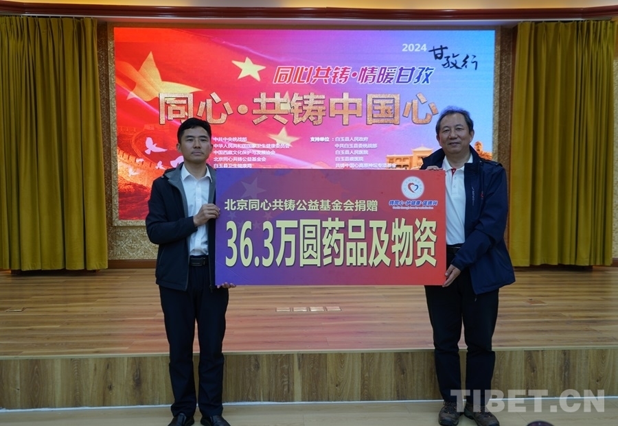 圖為白玉縣委常委、副縣長(zhǎng)陳兵(左)和專(zhuān)家團(tuán)團(tuán)長(zhǎng)、清華大學(xué)附屬北京清華長(zhǎng)庚醫(yī)院神經(jīng)外科主任醫(yī)師王貴懷(右)參加捐贈(zèng)儀式 攝影:周晴晴