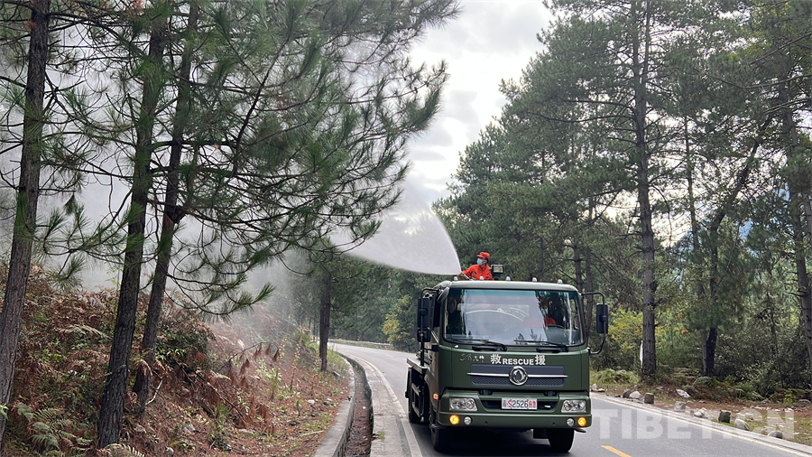 圖為森林消防員沿重點林區(qū)道路開展灑水增濕作業(yè)