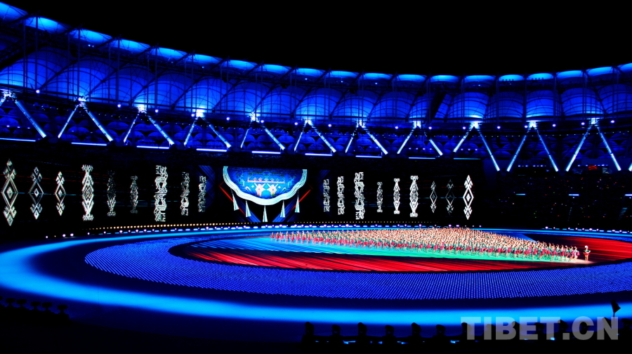 圖為第十二屆全國(guó)少數(shù)民族傳統(tǒng)體育運(yùn)動(dòng)會(huì)開(kāi)幕式上,以各民族各地方的“錦繡”為主題的節(jié)目《融情匯聚》 攝影:劉莉