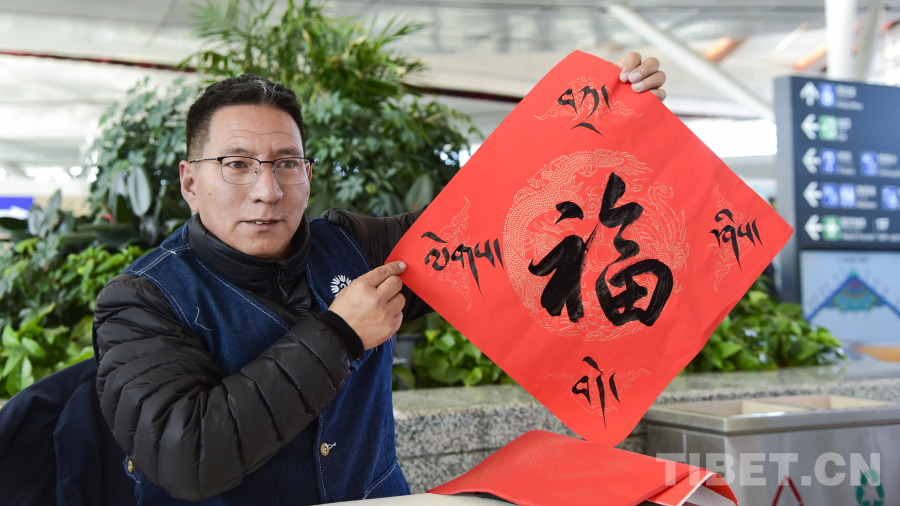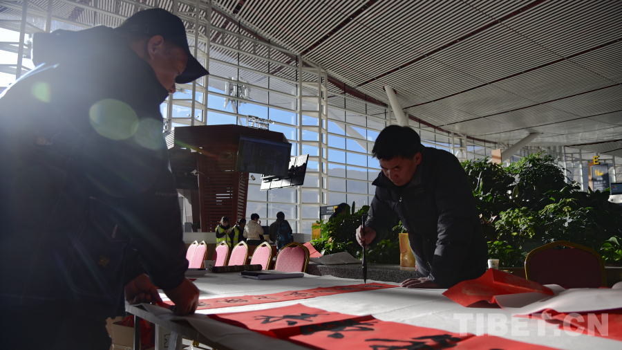 活動(dòng)現(xiàn)場(chǎng),29名西藏文藝志愿者走進(jìn)拉薩貢嘎國(guó)際機(jī)場(chǎng)航站樓,開(kāi)展送“?!弊?、送“扎西德勒”、送春聯(lián)、扎木念彈唱等活動(dòng),為過(guò)往旅客和工作人員帶來(lái)了一場(chǎng)別開(kāi)生面的文化體驗(yàn)。