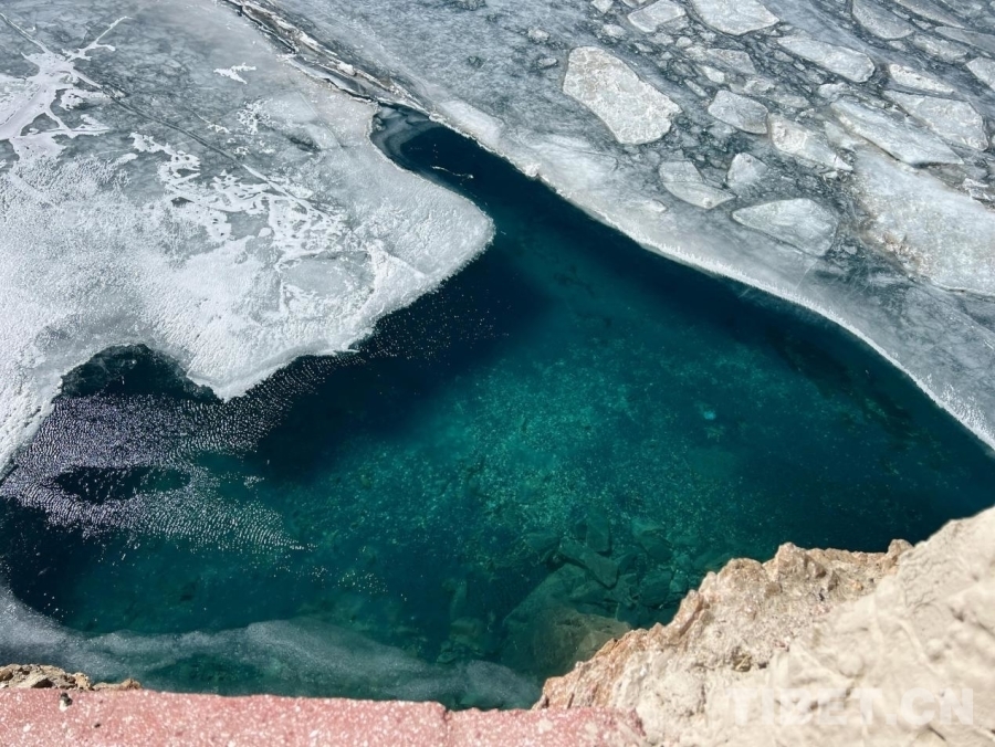 圖為普莫雍錯一角化冰,湖面清澈見底,如同一塊翡翠掉落在推瓦寺一旁,美麗動人。攝影:德吉卓瑪