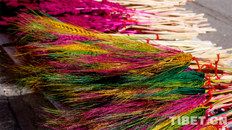 在藏歷新年年貨物品中,提及酥油花就不得不提它的“搭檔”“羅薩梅朵”,正是因為它們的裝點讓藏歷新年中本身就已很精致的“切瑪盒”更加亮眼?!傲_薩梅朵”被稱為“冬季里最美麗的花”,是經(jīng)過染色的麥穗和青稞穗制作成的“花卉”。在藏歷新年或節(jié)日之時,人們將其插在盛滿糌粑和青稞的“切瑪盒”上,寓意新的一年美滿、豐收。