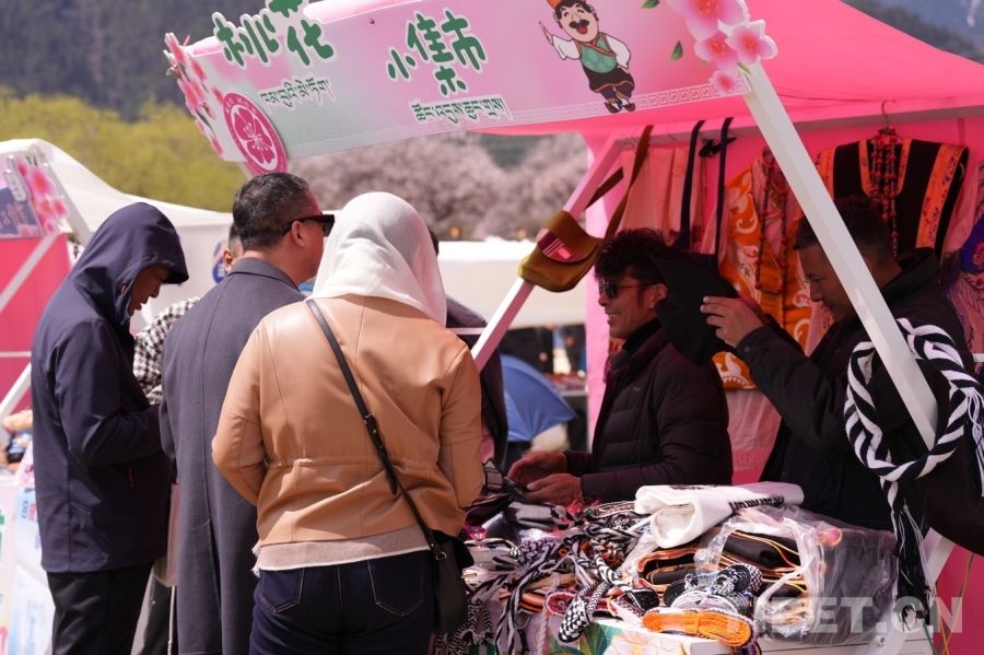 沿著蜿蜒的小路,一邊是錯(cuò)落有致的桃花樹(shù),一邊是特色集市?!斑@些是工布男女服飾、這是馬套、這是藏式包包……都是我們合作社的工作人員手工制作的?!痹谖枧_(tái)一旁的桃花小集市,林芝市巴宜區(qū)絲綢藏裝定制農(nóng)牧民專業(yè)合作社負(fù)責(zé)人尼瑪扎西正向游客一一介紹自家展銷點(diǎn)的產(chǎn)品以及其背后的文化和制作過(guò)程。經(jīng)過(guò)一番討價(jià)還價(jià),一千余元的“大單子”順利成交,游客將一件件精美的巴宜“小禮品”裝進(jìn)袋子和尼瑪扎西揮手告別。