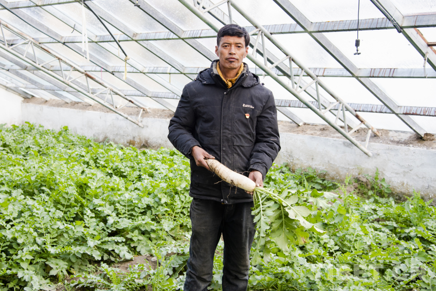 圖為定日縣長所鄉(xiāng)嘎旦村村委會主任頓珠在震后修繕的蔬菜溫室大棚內(nèi)為記者展示棚內(nèi)種植出的白蘿卜 攝影:趙振宇