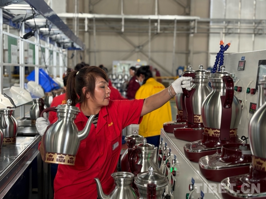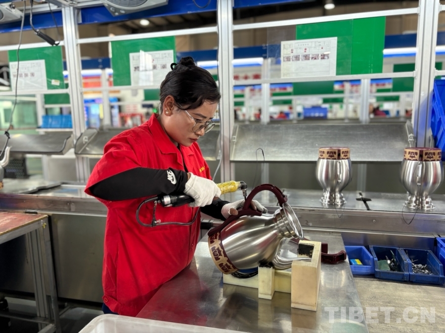 圖為員工央宗正在安裝全自動(dòng)酥油茶壺手柄