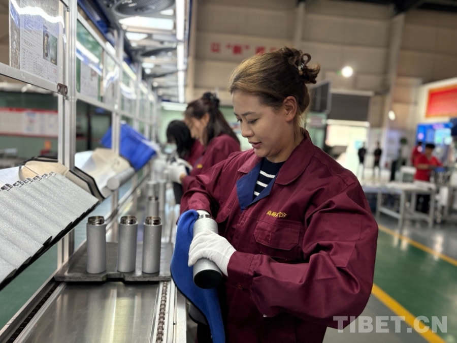 圖為員工次仁央宗對(duì)剛出廠的保溫杯做清理工作