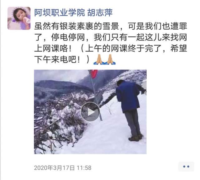 上完網(wǎng)課,胡志萍發(fā)了一條朋友圈感慨當(dāng)天的經(jīng)歷:“雖然有銀裝素裹的雪景,可是我們也遭罪了,停電停網(wǎng),我們只有一起到這兒來找網(wǎng)上網(wǎng)課咯!”而讓她沒想到的是,這條朋友圈隨后引發(fā)了一場愛心接力……