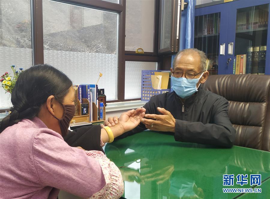 青才在位于青海省玉樹藏族自治州玉樹市仲達(dá)鄉(xiāng)電達(dá)村的藏醫(yī)診所為患者把脈(4月1日攝)。 新華社記者 王浡 攝