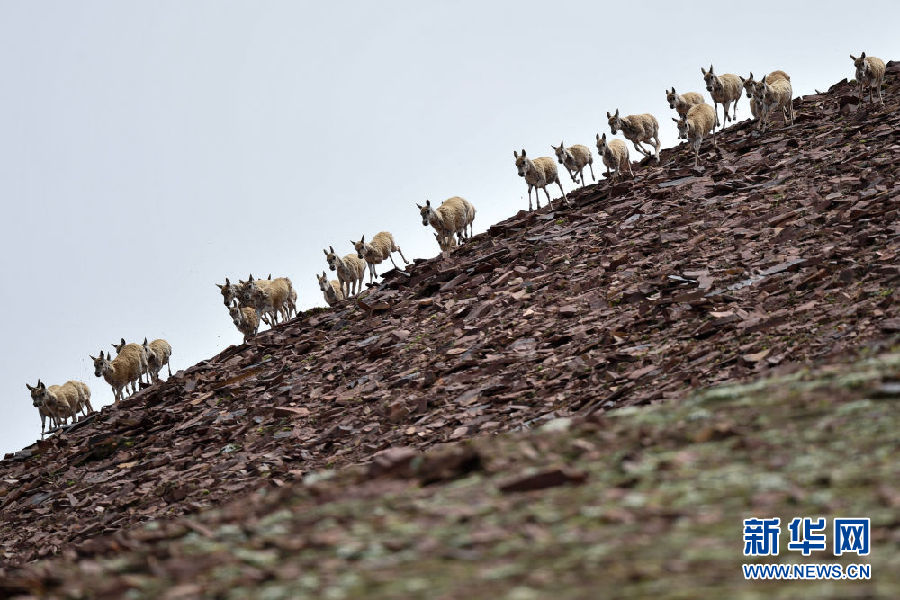 7月7日在可可西里卓乃湖區(qū)域拍攝的一群藏羚羊。新華社記者 張龍 攝