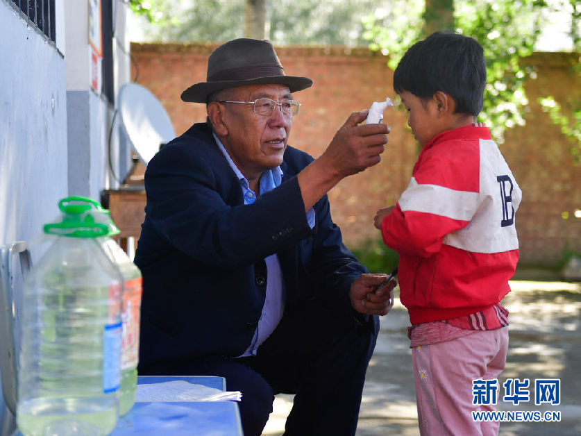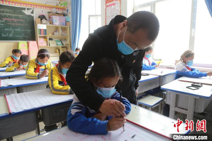 “排好隊,我們要量體溫了?!苯淌彝?,完么仁增蹲在椅子旁,用手持紅外線測溫儀挨個兒為孩子們測量體溫并逐一登記,起身時他有點吃力,“這是我?guī)У牡?8屆學(xué)生。”他說。