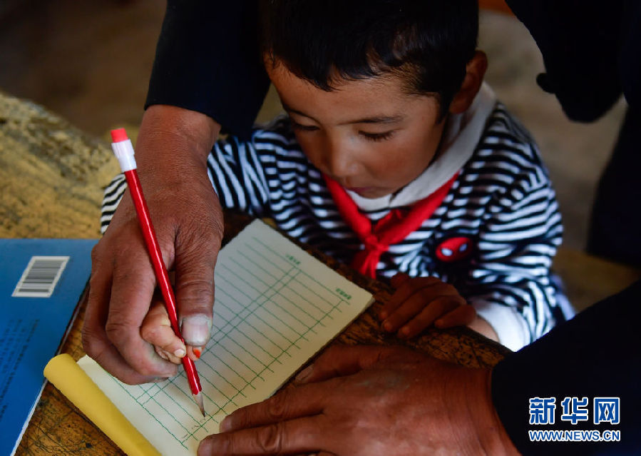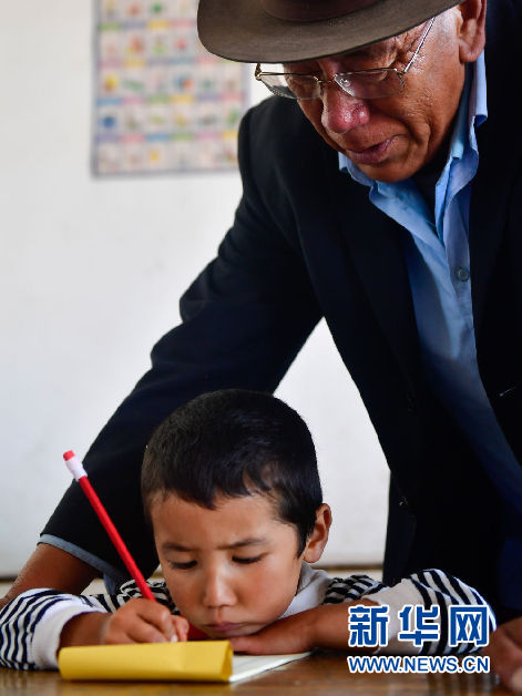 8月31日,在來塘村學(xué)校,完么仁增老師在指導(dǎo)一年級學(xué)生馬文輝學(xué)習。新華社記者 張龍 攝