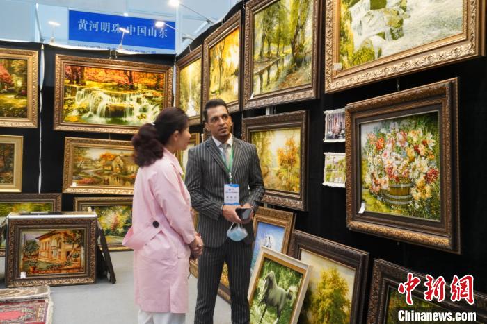 圖為參展商向咨詢的客商介紹地毯。文思睿 攝