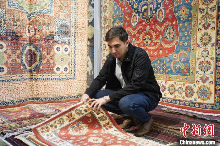 圖為來自土庫曼斯坦的留學(xué)生Resul欣賞地毯。文思睿 攝