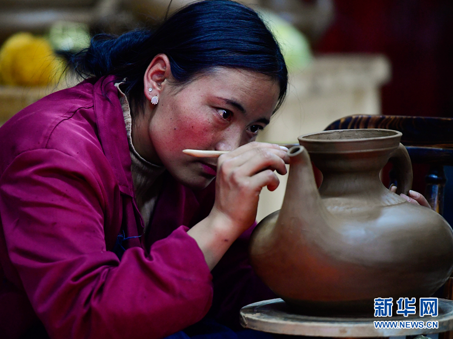 出身黑陶世家的謝格太就是當?shù)赜忻暮谔占紟煛?014年,謝格太成立班瑪黑陶旅游產(chǎn)品開發(fā)有限責任公司,規(guī)?;a(chǎn)和銷售黑陶,并帶領學徒一起鉆研黑陶技藝,傳承和創(chuàng)新黑陶手工技藝文化。和泥、捏制、打磨、發(fā)酵、火燒、熏黑、拋光,經(jīng)過十幾道工序的磨煉,學徒們在謝格太的帶領下,不僅學到了技藝,傳承了技術,每月還能拿到數(shù)千元的生活補助。